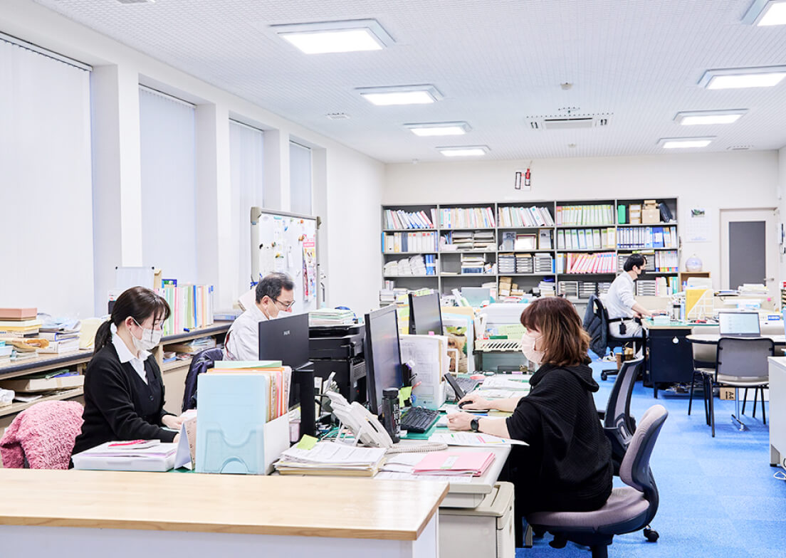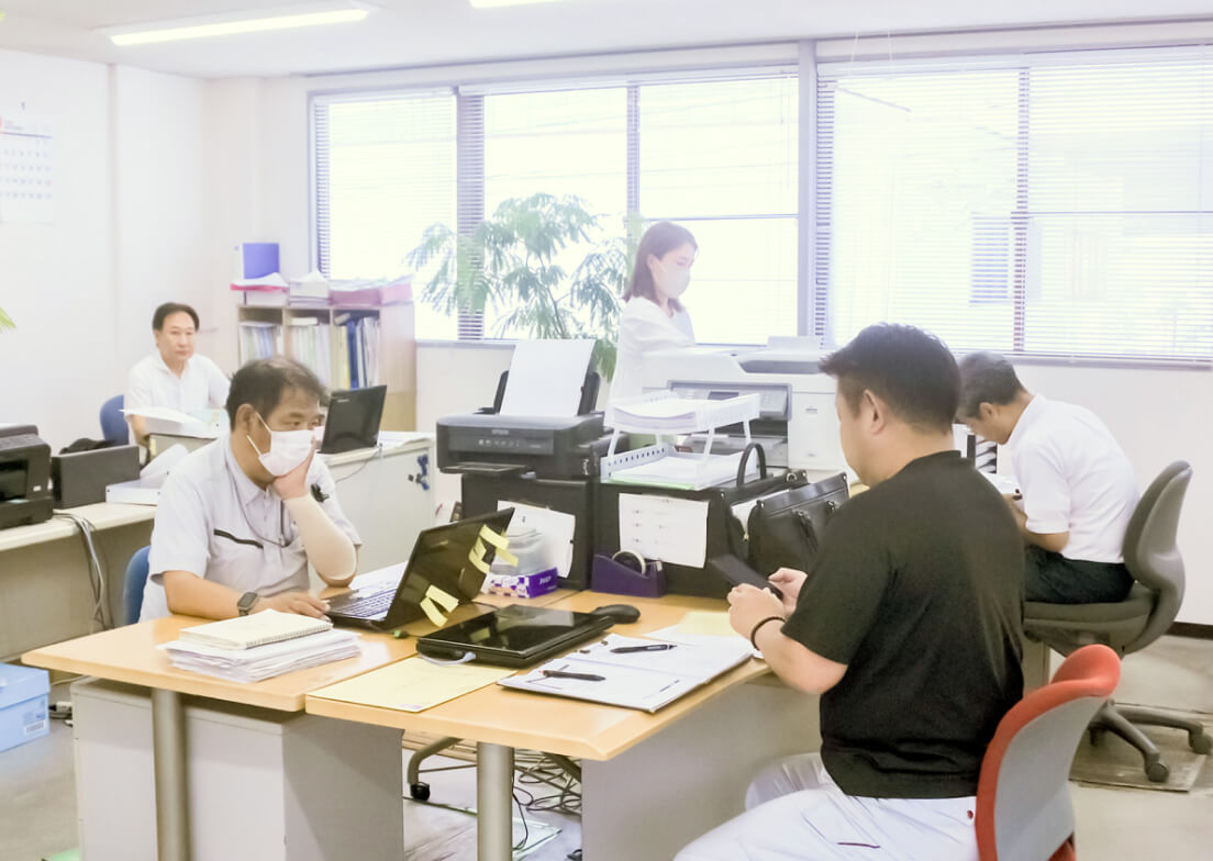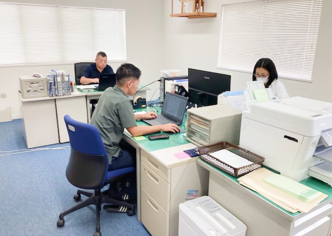 本社に入ってすぐ見えるのは、フロント/総務部です。日中は社員が業務のため出払っていることが多く、受発注の処理、手配等、主な事務作業はもちろん、お客様の持ち込み等にも対応しています。