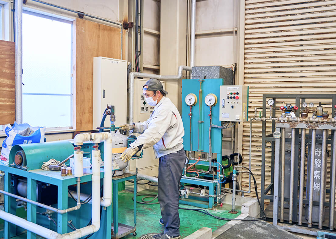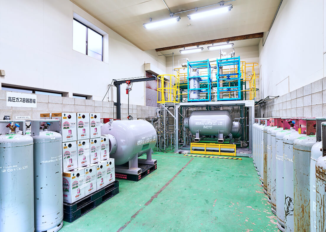 フロン類再生プラントでは、回収されたフロン類の再生処理、再生フロンガスの充填等を行っています。