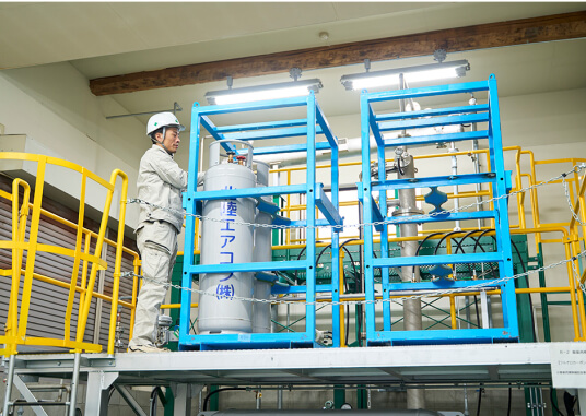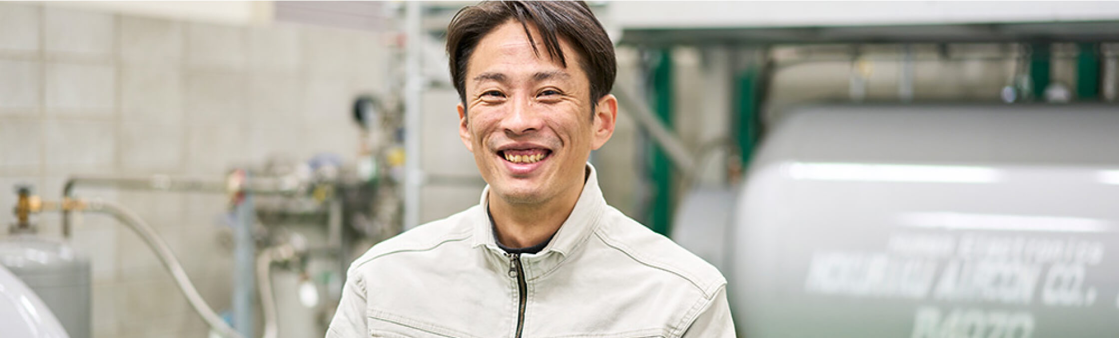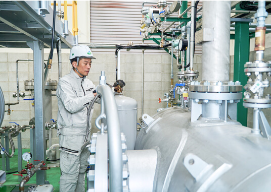 再生プラントの運営全般を任されています。機械によってガスの再生処理を行うので、なるべく機械を止めないよう、周りの機器を含む機械のメンテナンスを欠かさず、安定して処理できるようにするのが主な業務です。