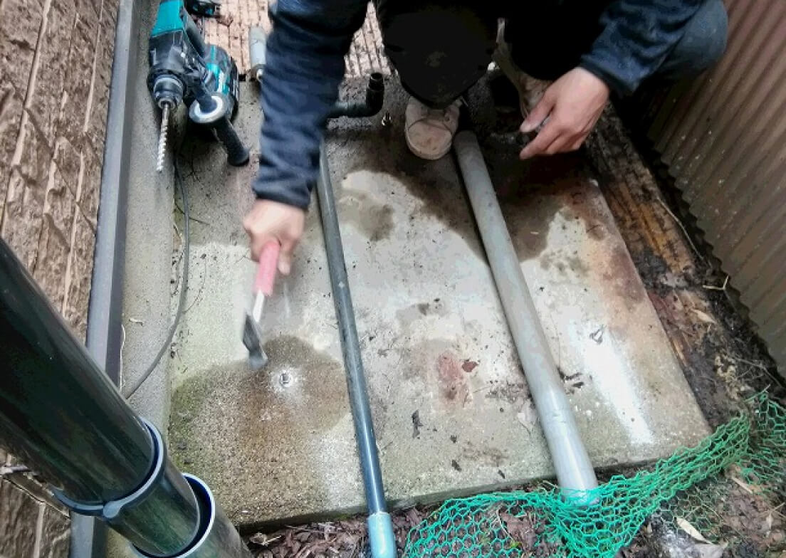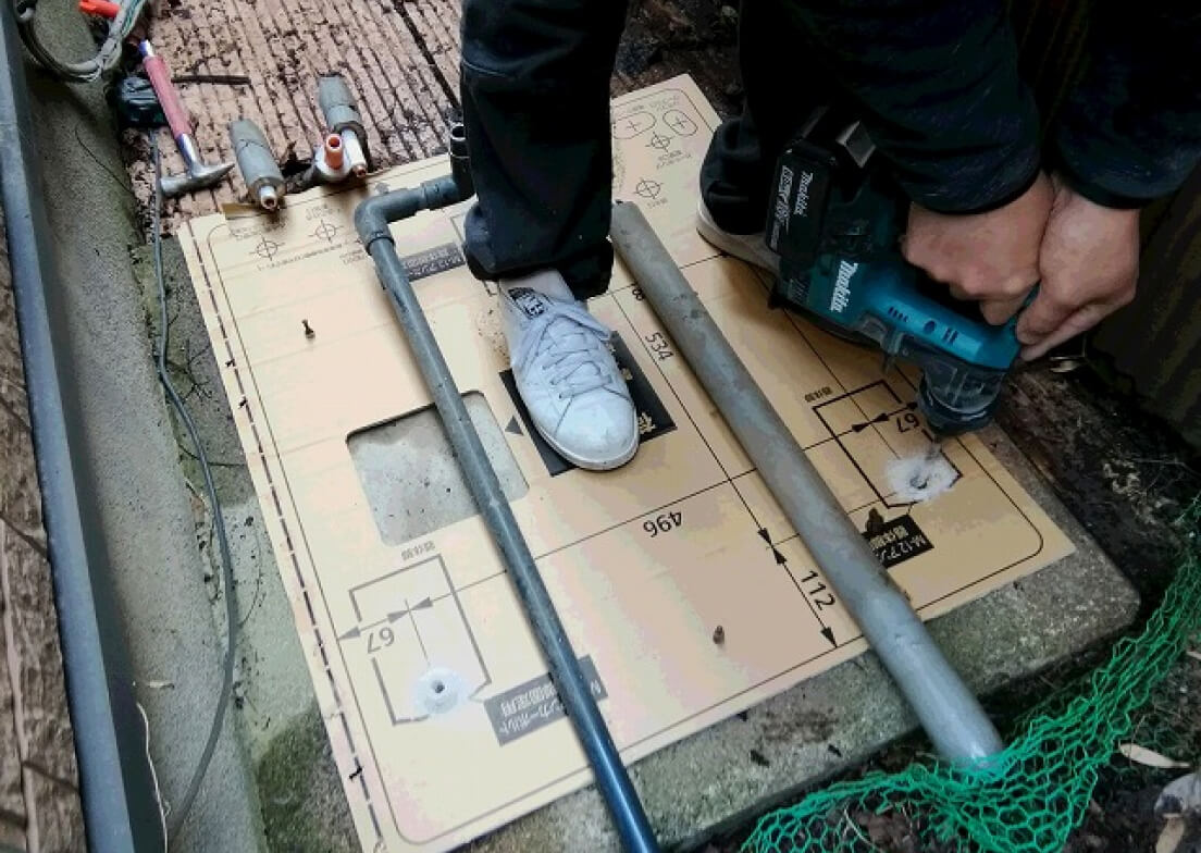型紙に沿って基礎にアンカー用の穴開け
