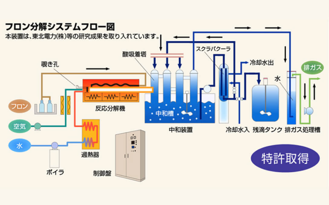 フロン分解システムには、東北電力(株)等の研究成果を取り入れた上記装置を使い、フロン排出抑制法の基準に沿って破壊します。