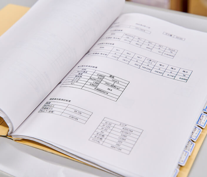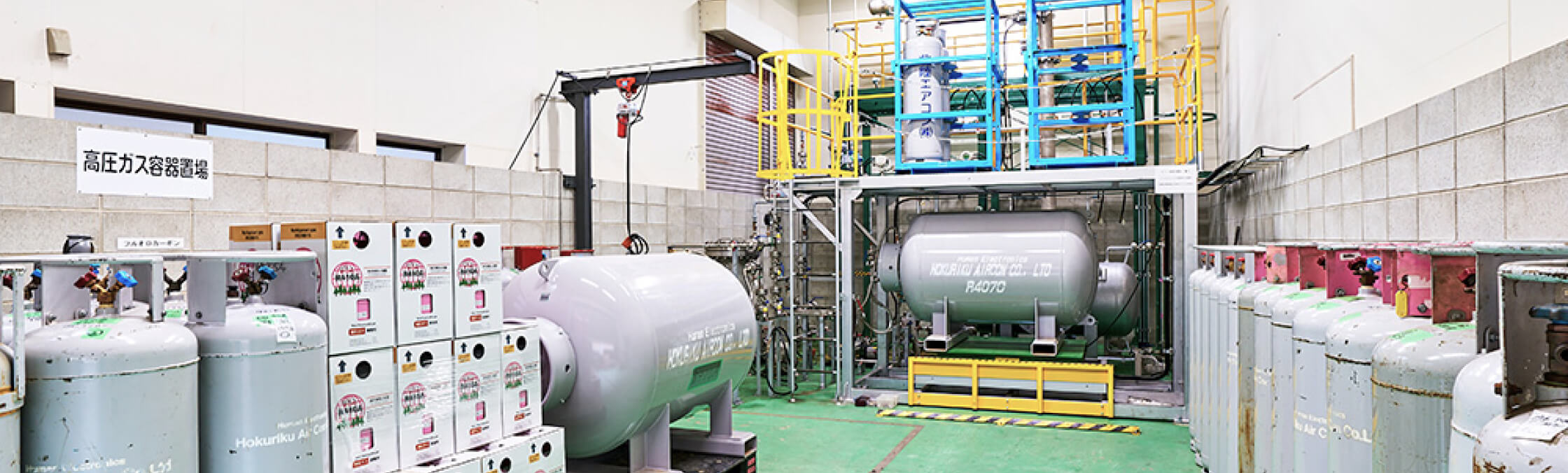 当社本社工場にて、フロン排出抑制法を遵守し、第一種フロン類再生に関する運用の手引き、またはフロン類の破壊に関する運用の手引きに沿って、再生または破壊処理を行います。